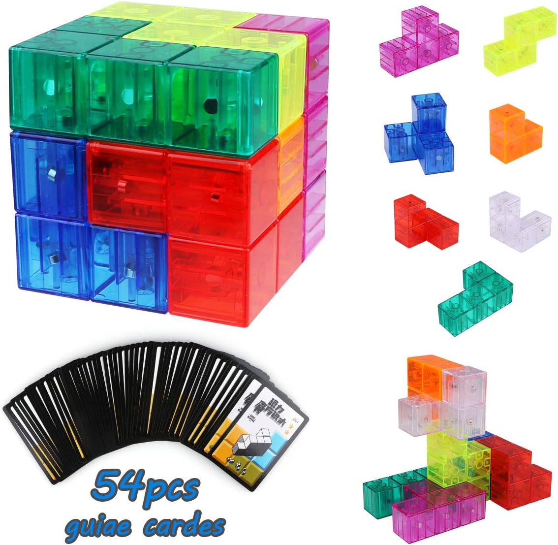 ❤ Colorful Magnet Cube ❤ - Magic Cubes comprend des briques de construction 3D de 7 pièces avec des cartes de guidage de 54 pièces (méthode de montage totale de 108). Chaque bloc est magnétique afin que le cube soit étroitement connecté une fois assemblé. Cela améliorerait la capacité d'assemblage en formant des centaines de motifs géométriques.